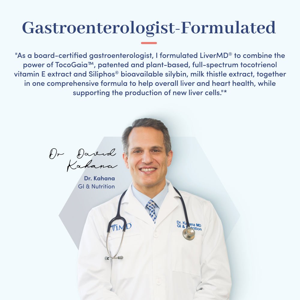 LiverMD® features two trademarked, highly absorbable ingredients: Siliphos®, a patented, bioavailable form of silymarin (milk thistle) widely used for liver support, and TocoGaia®, a plant-based vitamin E complex containing all eight tocopherol and tocotrienol isoforms.*
